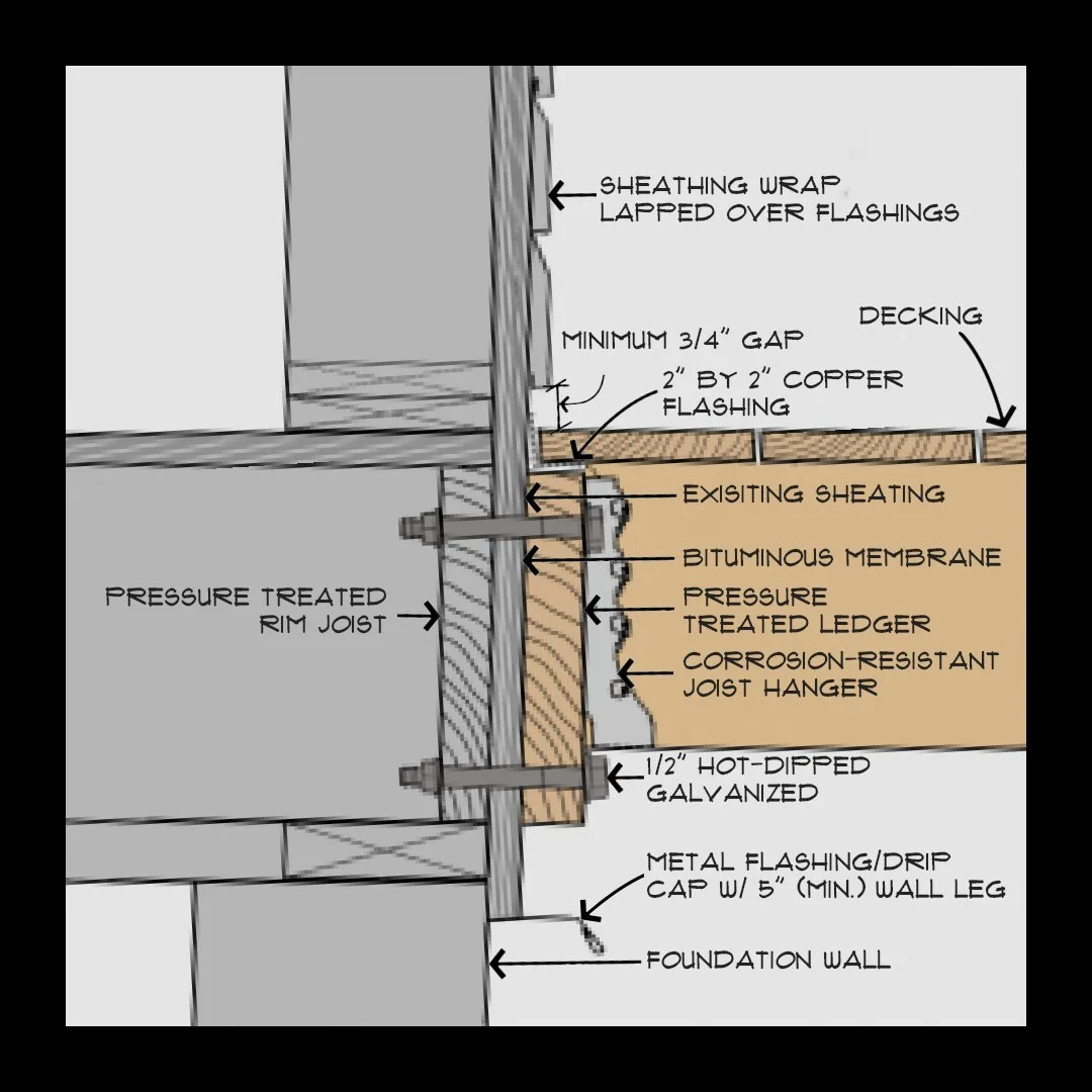 Flashing is the unsung hero of deck longevity. You will be surprised how many deck builders may overlook this or even abandon this step. In the detail, I am calling out for a 2-inch by 2-inch copper flashing to be placed over the ledger. The purpose of this flashing is to direct water away from the house. Above that, the sheathing wrap laps over the flashing, ensuring any rainwater drains outward rather than seeping behind the assembly. A layer of bituminous membrane adds an additional waterproof shield, separating the wood from the sheathing and protecting against rot. Installed in the right sequence, these layers create a continuous drainage plane that allows the building envelope to “breathe.”