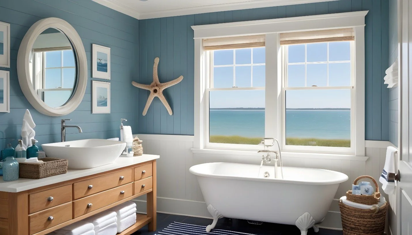 A coastal-themed bathroom offers a blissful escape, where the gentle sounds of sea waves and the soothing scent of sea salt can whisk you away to the beach in an instant.